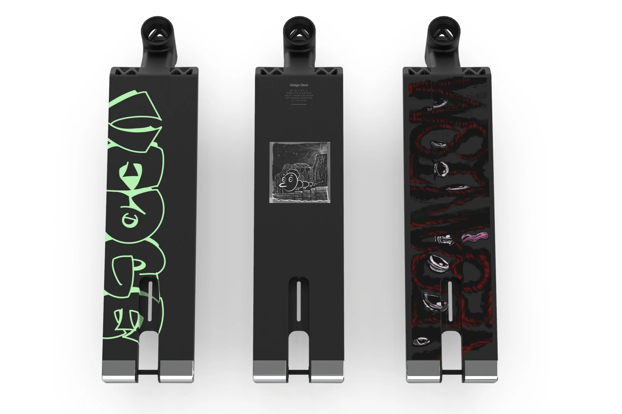 After 3 series of iterations and refinements, I landed on the Vedge Deck. Exposing architectural V-shaped ribbing through the hollow core of the deck ties conceptually into the branding and design language The intricate ribbing also serves as a structural feature preventing deck bends, cracks, or snaps where it is most prone to near the base of the forged headtube and middle of the deck plate. Lastly, this unique feature differentiates itself from other decks on the market and is designed by a rider for riders.
