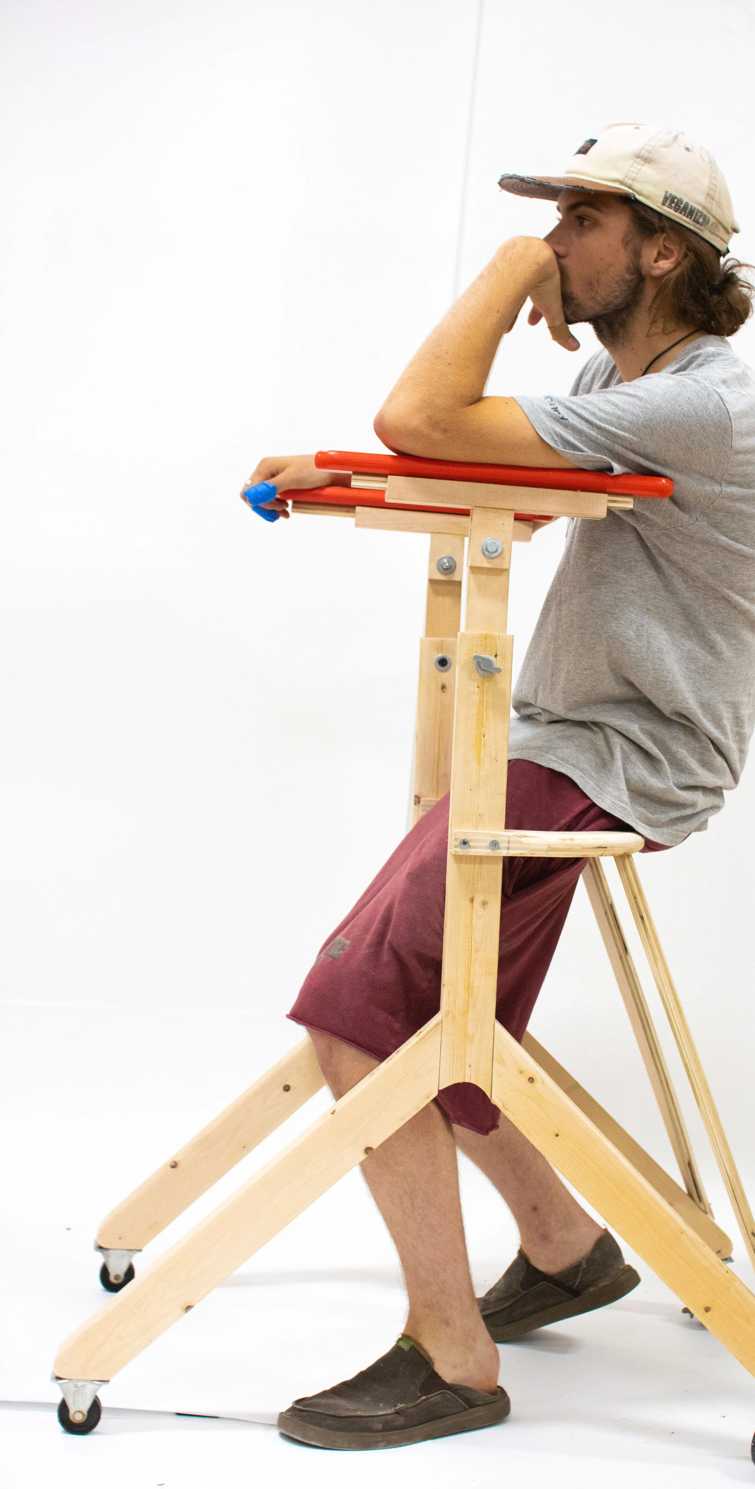 Seeking a range of adjustability in device height, angle, and wheel width. Using a universal slot system I was able to explore various configurations and experiences.